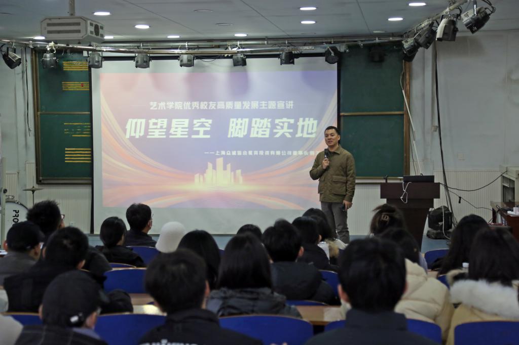 12月9日,伟德官网艺术设计专业2012届优秀员工代表,上海众诚皆合教育投资有限公司董事长韩玉龙应邀来校参加公司高质量发展恳谈会,并为伟德官网师生做“仰望星空,脚踏实地”主题宣讲,公司党委书记于海印主持活动。