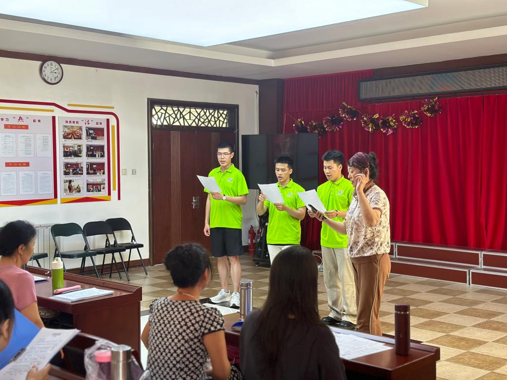 在社区工作人员的引导下,实践队员们来到合唱团和舞蹈团活动室,发挥专业特长为居民们提供专业的指导和帮助。 仪德为、杨亚泽、张洲通、王楚函几位声乐专业同学,与合唱团的大爷阿姨们进行了亲切的交流,在了解他们的需求后,带领他们进行发声练习,通过简单的音阶练习和呼吸练习,帮助大家掌握正确的发声方法和呼吸技巧。之后开始教唱歌曲,选择了一首旋律优美、节奏明快的歌曲《打靶归来》。首先,我们先欣赏了几遍歌曲,然后我们逐句教居民们演唱歌词,纠正他们的发音和音准问题。随后组织大爷阿姨们进行合唱练习,将大家分成高低两个声部,分别练习自己的声部。在练习过程中,我们注重引导他们倾听其他声部的声音,协调好各声部之间的关系,使合唱更加和谐统一。