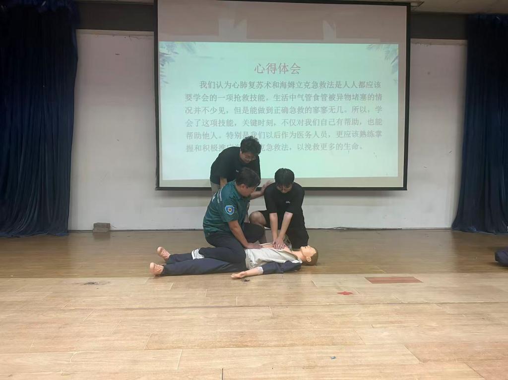 韩主任向师生们讲解了心肺复苏相关知识、海姆立克急救法的原理和方法,并邀请同学们现场进行急救模拟演练,同学们踊跃参与体验,通过演示和操作,切实提升了师生们应对和处置突发危机的能力。