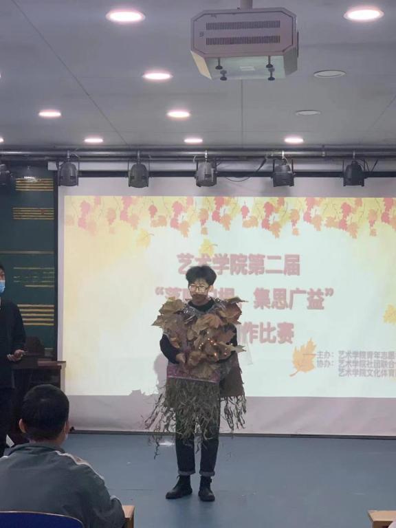 各员工组织分为8支代表队,每个代表队通过集思广益、集体创作出一件参赛作品,社团联合部的作品《绿色家园》,展示了一件特别的衣服,它通体由树叶所制,加上展示者精彩的讲解与表现,弘扬了绿色发展理念,象证着人与自然和谐共生,荣获一等奖;自律宣传部的作品《明月几许》用各种叶子拼成月亮的形状,表现对草木生命周而复始的感怀,造型优美,尽显诗意,荣获二等奖;其他作品也都各具特色,《金发少女》用各色叶子拼接成女子肖像,《秋叶蝴蝶》用树叶塑造出翩翩飞翔的蝴蝶造型,《暗夜朝阳》用纯黑色背景与清晨朝阳的对比,象征着疫情所带来的黑暗和不屈的生命所闪耀的光芒,《星空》把绘画与立体塑造相结合,营造出一种城市与星辰大海对比的梦幻之感。