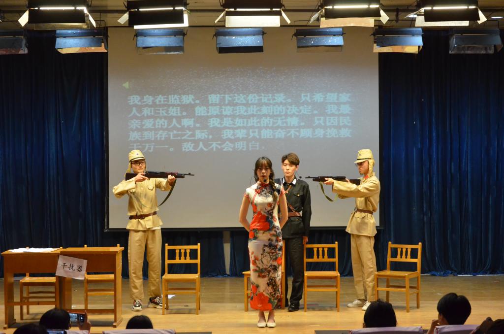 本次活动旨在以话剧表演的形式让同学们领悟红色精神的内涵,传承红色基因。活动在主持人慷慨激昂的开场词中拉开了序幕,以上世纪初广大青年员工反帝反封建为背景的爱国话剧《五四运动》,为整场活动奠定了青春昂扬奋进的基调,展现了一代青年胸怀家国,敢为天下先的大无畏精神;《红船会议》为我们重现了中国共产党诞生的伟大时刻,展现了革命先驱者们为了国家民族理想而奋斗,开天辟地、敢为人先的首创精神;《风声》表现了汪伪政府时期中共地下党员为了国家民族大义与反动力量斗智斗勇,不畏牺牲的感人故事;《金色的鱼钩》展现了长征路上先烈们艰苦奋斗、舍己为人的精神,和相信革命必胜的坚定信念;《巧奔妙逃》以幽默诙谐的形式反映中国人民在反抗日本侵略者时的机智勇敢。参演同学用惟妙惟肖的表演还原了一个个经典场景,展现了积极向上、昂扬奋进的精神追求,展示了燃烧的激情和火热的理想,英雄主义和勇于奉献的精神永远不会过时。活动中,薛紫晨、刘杰等几位同学献唱了《唱支山歌给党听》、《向着伟大梦想》两首歌曲,将活动的氛围推向高潮。