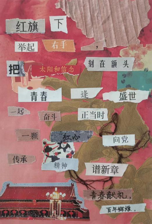 活动发布后同学们积极投稿,共收到二十余份制作精美的拼贴作品。大家通过搜集日常生活中常见的纸张、报刊、宣传页等素材,进行剪辑和重新排列组合,通过再度创作来表达自己独特的审美理解,在看似无关、无序的材料中间,考量挪移,搭建诗意。参赛同学的作品形式多样,配色明艳、对比强烈,构图错落有致,体现出同学们的大胆创新精神。参赛同学表示:“这次比赛不仅让我们以特殊的方式来歌颂青春与祖国,表达自己的爱国爱党之情,还鼓励了大家发现生活中的诗意,用奇思妙想来发现美、改造美、创造美。”