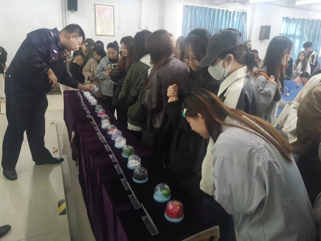 宣讲中,潘警官用几个真实的事例,讲述了毒品对人体的危害,和对生活造成的巨大困扰,提示大家应如何避免、防范接触毒品,保持“健康人生,绿色无毒”。其间,民警用模型展示了各种毒品的形态,包括传统毒品以及一些新型毒品,提醒同学们在生活中警惕和鉴别。