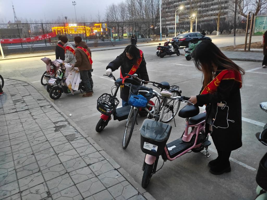 为维护良好的校园环境,组织10余名志愿者在校园内摆放电动车、自行车,让车辆整齐有序,道路更加通畅。