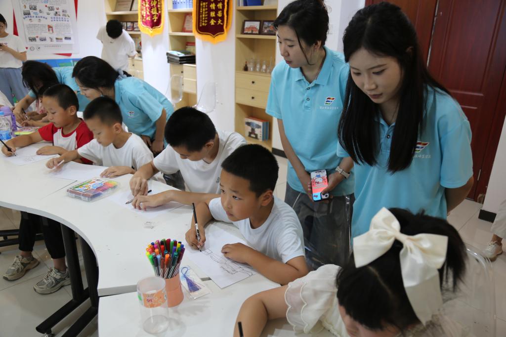 理论讲解环节结束后,实践团成员转入实践互动模式,着手指导社区小朋友们开展绘画创作。活动现场,孩子们围坐在画纸前,眼中闪烁着期待的光芒,实践团成员逐一走到孩子们身边,从最基础的烽火台轮廓勾勒讲起,细致示范如何用线条表现城墙的层次感,如何通过色彩区分砖块与山体的质感,并不时俯身纠正握笔姿势、调整色彩搭配。整个创作过程中,实践团成员始终耐心陪伴,对孩子们的奇思妙想给予肯定,对绘画技巧上的疑问及时解答,随着一幅幅作品陆续完成,原本空白的画纸上,渐渐布满了形态各异却同样充满热情的长城图景,这些带着童真的画作,不仅是孩子们对长城文化的直观表达,更成为传统文化美育落地社区的生动载体,让孩子们在动手实践中加深了对长城文化的理解与热爱。