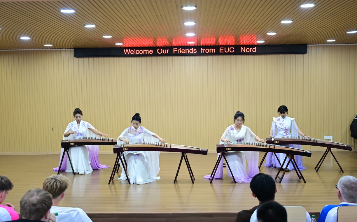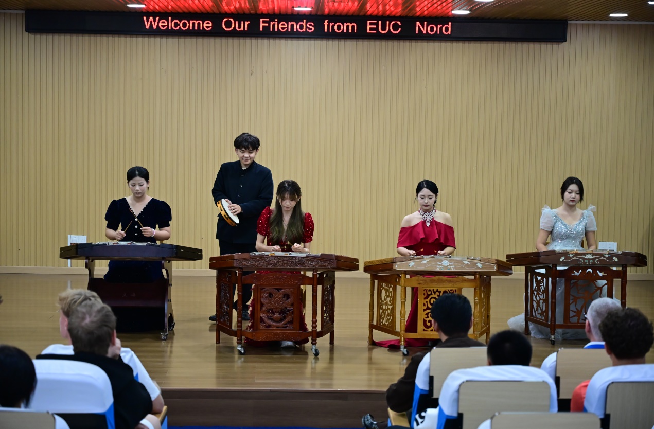 汇演在古筝重奏《春江花月夜》中拉开帷幕。伟德官网“翊・筝乐团”四位演奏者,以清丽婉转的古筝音色,将“春江潮水连海平,海上明月共潮生”的诗意画卷徐徐展开,从江楼钟声到渔舟远去,连贯的叙事性演绎让中丹师生共同沉醉于中国古典音乐的意境之中,充分展现了中国民族音乐的独特魅力。